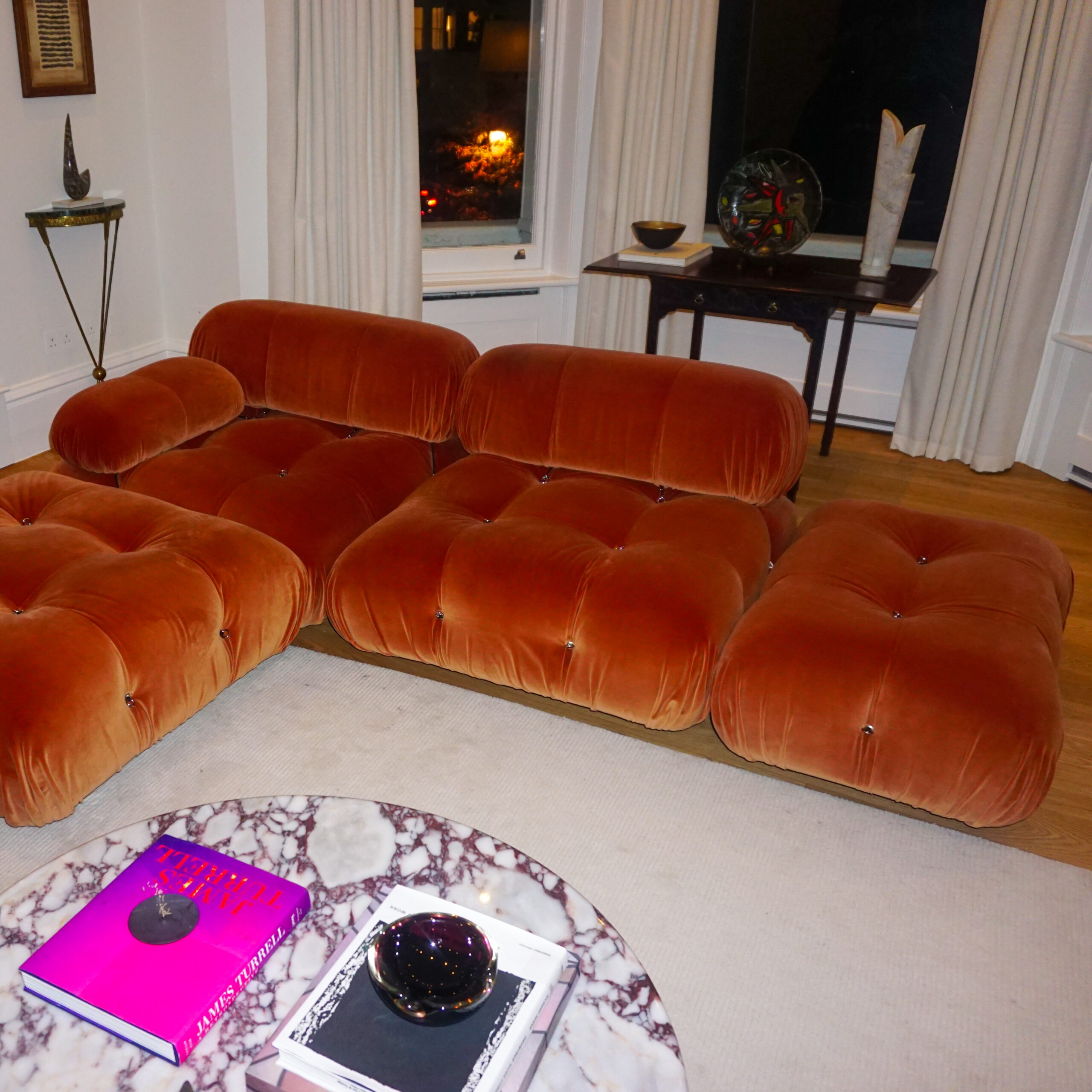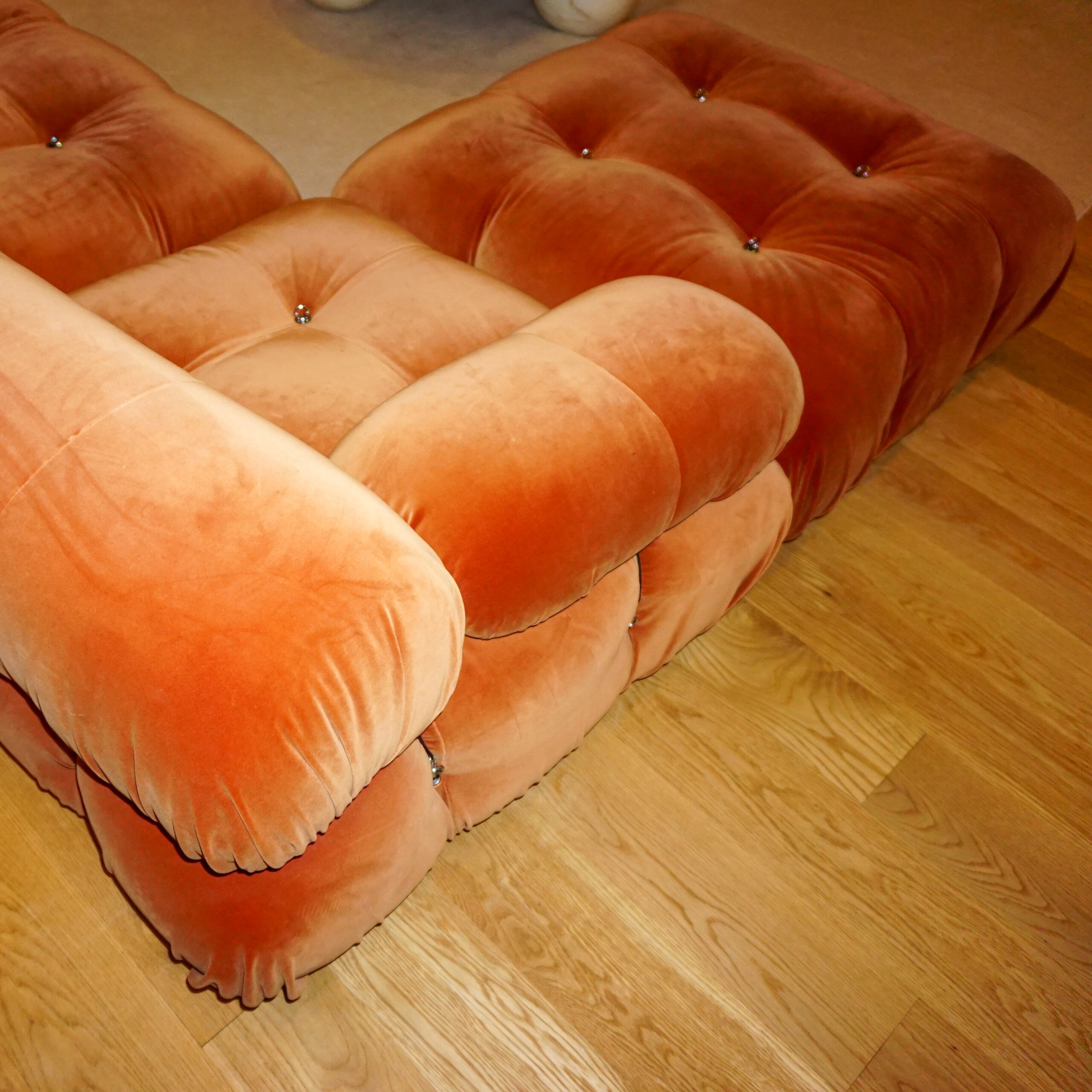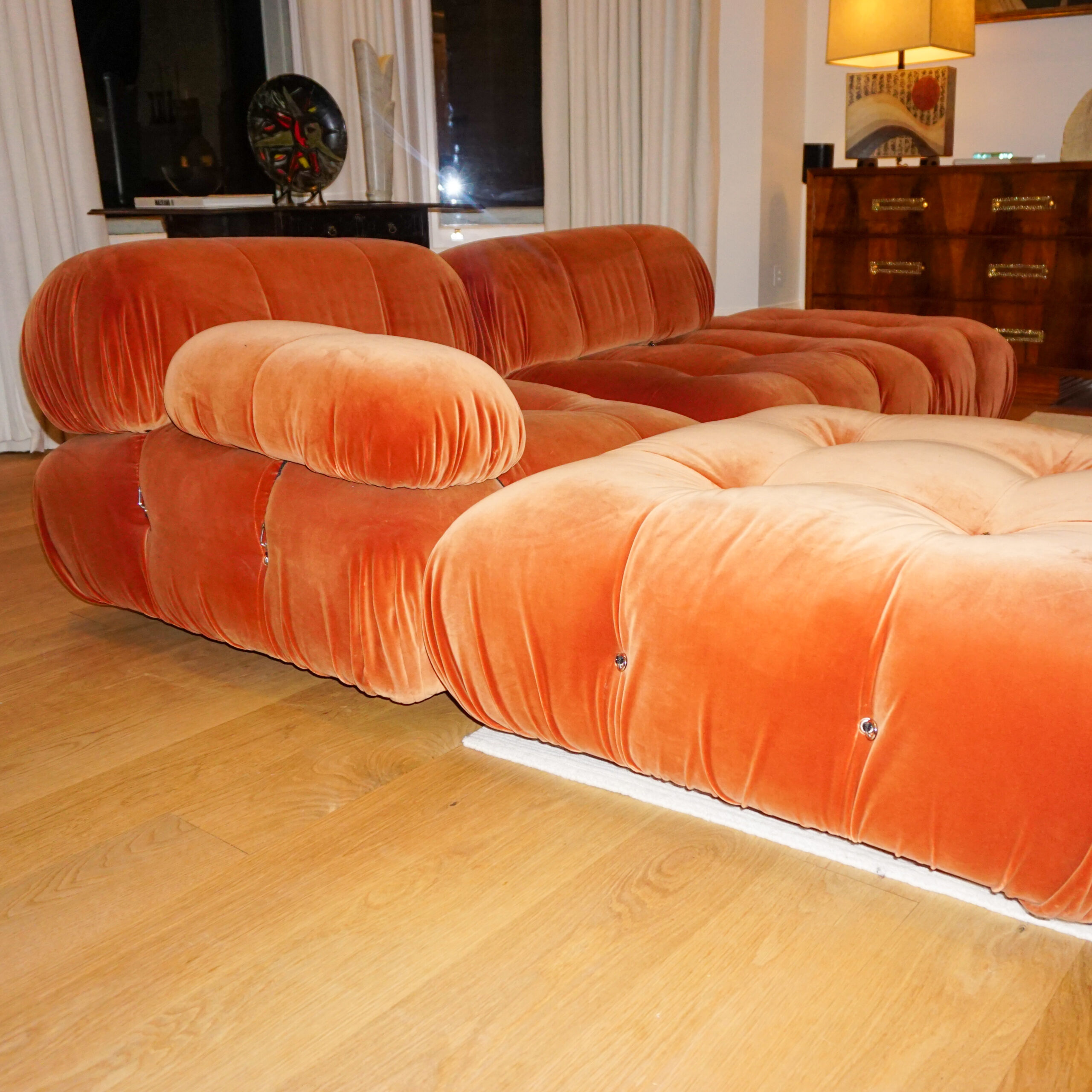 This is a more recent version, in orange velvet with silver details, two main seater with side ottomans.