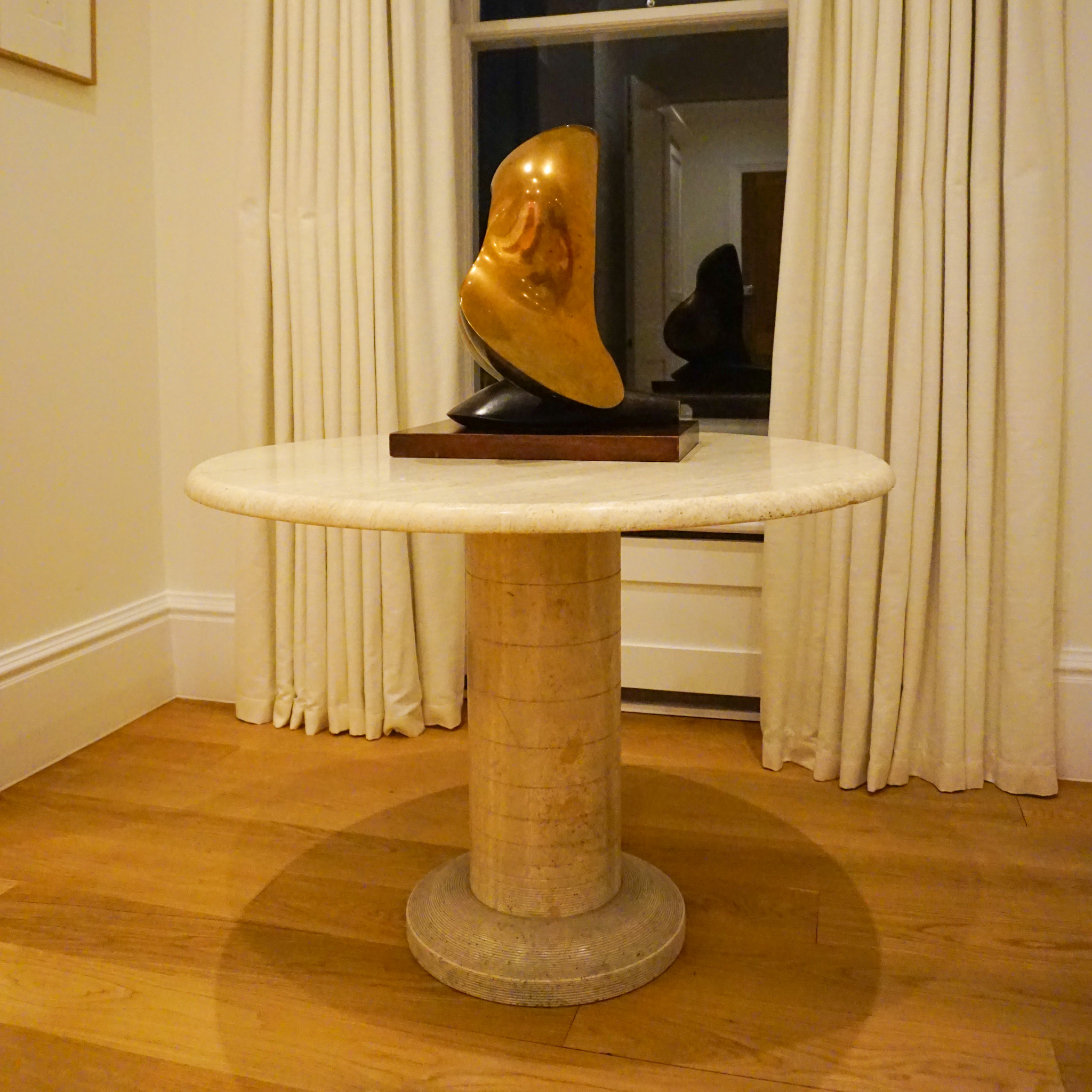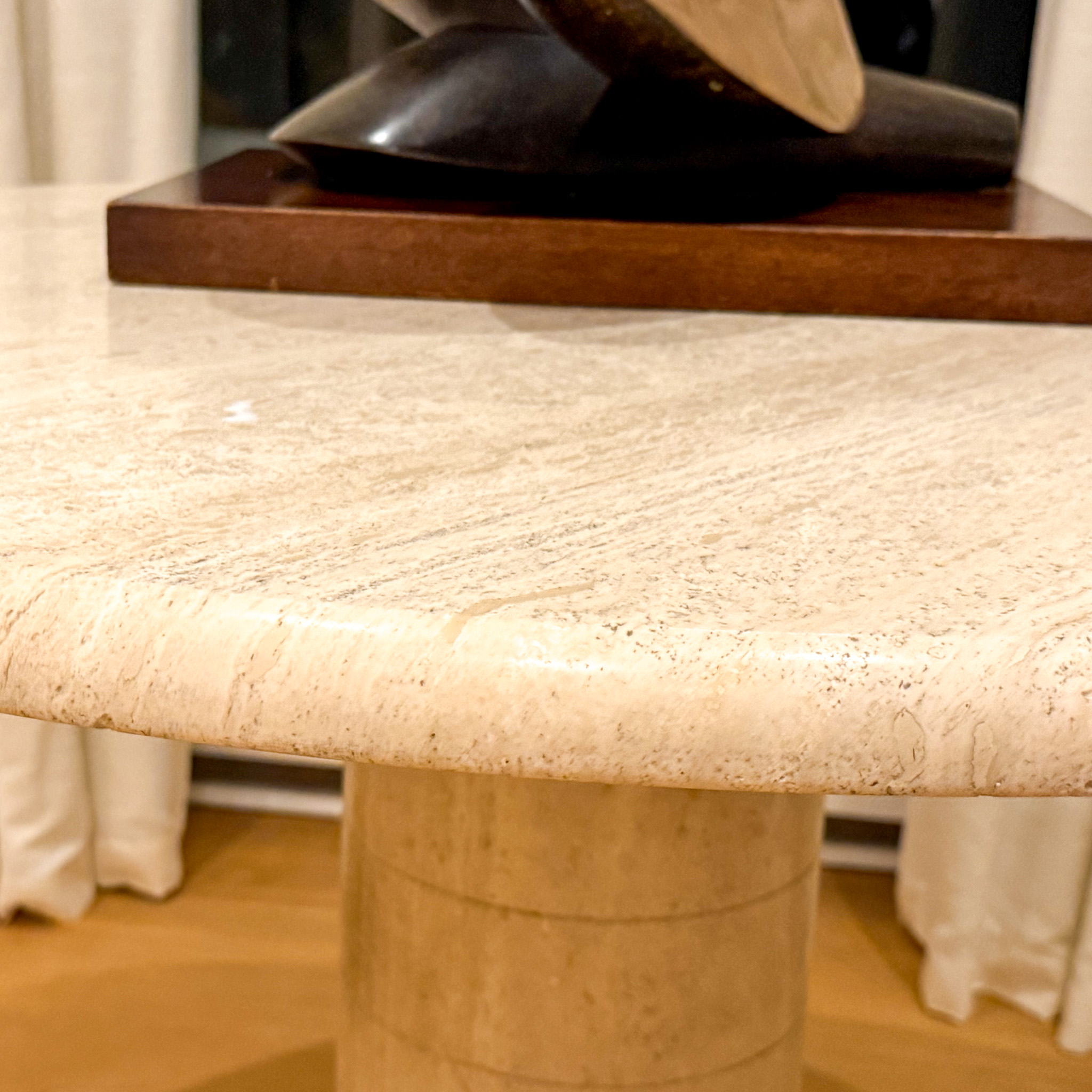 This striking mid-century pedestal table is crafted entirely from travertine, offering a refined presence and a natural sense of weight and permanence. Its round top rests on a cylindrical column giving the piece both sculptural character and architectural clarity.